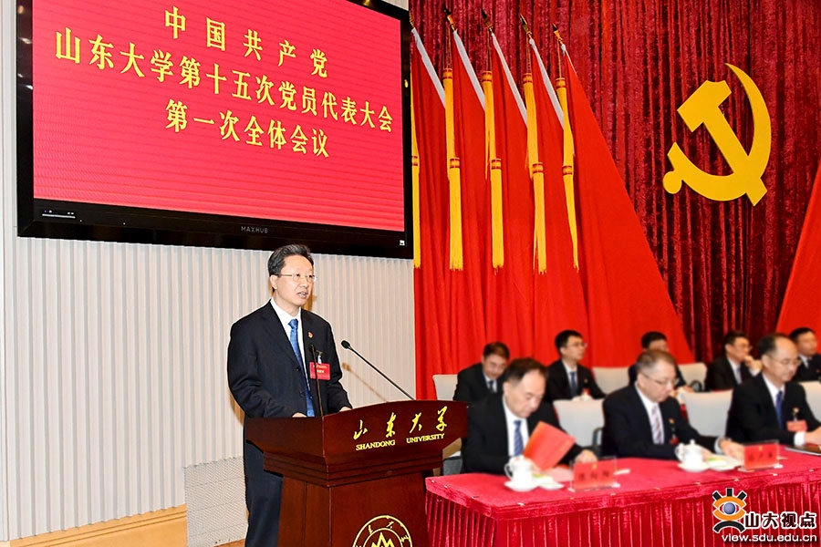 山东大学校园生机勃勃,知新楼A座三层报告厅气氛热烈。主席台上方悬挂着“中国共产党山东大学第十五次党员代表大会”的会标,十面鲜艳的红旗分列主席台两侧,正中簇拥着的党徽熠熠生辉。会场后方,山东大学校名、校徽与“勇担使命 敢闯敢创 全面图强 为加快建设担当民族复兴大任的世界一流大学而团结奋斗”的横幅相映生辉。