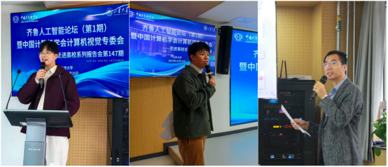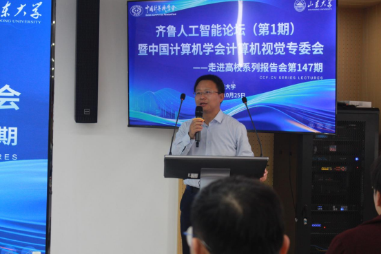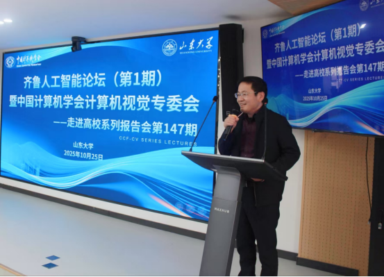 2025年10月25日下午,由中国计算机学会计算机视觉专委会(CCF-CV)主办,山东大学浪潮人工智能学院承办的第147期CCF-CV走进高校系列报告会——“多模态智能感知与理解”学术论坛在山东大学中心校区浪潮人工智能学院212报告厅成功举行。本次报告会邀请了来自中国科学院自动化研究所王亮研究员、南京航空航天大学秦杰教授、哈尔滨工业大学张盛平教授、中国科学院计算技术研究所宋新航副研究员及西北工业大学赵斌副教授等多位顶尖专家学者,共同探讨多模态感知、具身智能及视觉理解的前沿进展与未来趋势。本次活动由山东大学浪潮人工智能学院助理教授何科技担任执行主席。报告由山东大学何科技助理教授、丛润民教授、元辉教授依次主持。