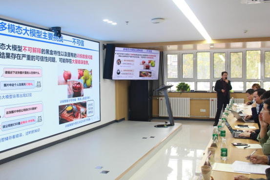 学术报告环节,多模态人工智能系统全国重点实验室副主任,中国计算机学会计算机视觉专委会副主任,中国图象图形学学会副理事长,中国科学院自动化研究所王亮研究员首先上台演讲,报告题目为《多模态大模型发展与应用》。王亮研究员系统梳理了多模态大模型从2022年至今的快速发展历程,指出当前模型在不可信、不安全、评测难、资源开销大、推理能力欠缺等方面仍面临挑战。王亮研究员重点介绍了其团队在知识蒸馏、幻觉检测、知识编辑、多模态评测、安全对齐与空间推理等方面的创新工作,提出了“边看边画、边画边想”的交互式推理框架,显著提升了模型在复杂任务中的表现。