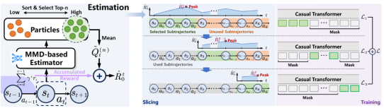 针对上述瓶颈问题,论文提出了峰值回报贪心切片框架(PRGS),在时间步层面对离线轨迹进行精细化建模,显式挖掘并利用高质量子轨迹信息,突破了传统以整条轨迹为单位的学习范式。该框架由三部分构成:一是基于最大均值差异(MMD)的分布式回报估计器,对单步状态-动作对的潜在回报进行乐观估计;二是基于回报峰值的贪心式子轨迹切片策略,在时间步层面递归提取高价值决策片段用于训练;三是在推理阶段引入自适应历史截断机制,使测试过程与子轨迹训练范式保持一致,有效缓解训练与推理不匹配问题。